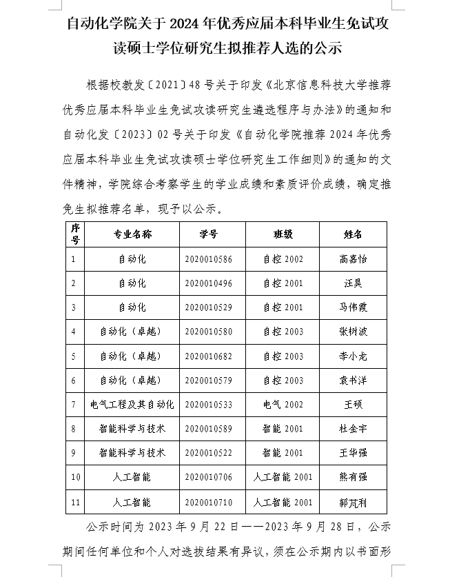 自动化学院关于2024年优秀应届本科毕业生免试攻读硕士学位研究生拟推荐人选的公示