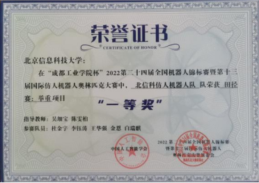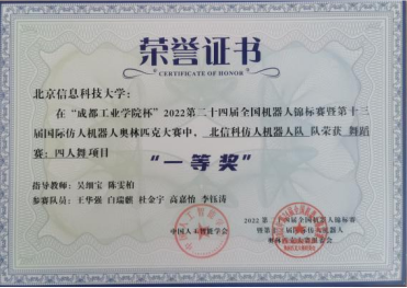 2022年11月26日至28日,由中国人工智能学会主办、中国人工智能学会青年工作委员会协办的第二十四届全国机器人锦标赛暨第十三届国际仿人机器人奥林匹克大赛在成都工业学院宜宾校区隆重举行。俱乐部成员在陈雯柏、吴细宝两位老师的指导下,参加了仿人型机器人田径和体操两大类共五项比赛,经过多日的调试与准备,获得了4项国家级一等奖和1项国家级二等奖的好成绩。
