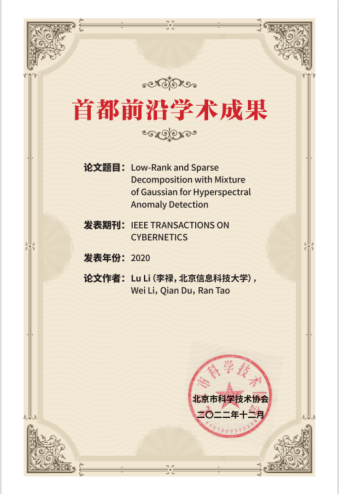 近期受北京自动化协会推荐,我院人工智能系李禄老师撰写的《Low-Rank and Sparse Decomposition With Mixture of Gaussian for Hyperspectral Anomaly Detection》论文,被北京市科学技术协会授予2022年首都前沿学术成果奖。据悉该论文李禄老师作为第一作者,与北京理工大学李伟教授、陶然教授以及美国密西西比大学杜谦教授,合作发表在《IEEE Transactions on Cybernetics》期刊上,并在2022年被收录在ESI 热点论文(前1‰)。此次获奖是对项目团队在学术研究上的肯定与鼓励,未来项目组成员将继续在计算机视觉,遥感图像处理方面开展研究工作。
