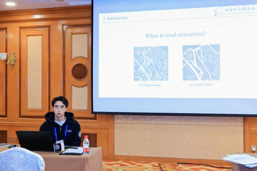 熊有强同学使用基于U型多尺度Vision Transformer模型的深度学习方法对遥感影像中的道路进行了提取,并在多个公开数据集中获得了SOTA的效果;王仲琦同学利用自注意力机制和图神经网络,对遥感高光谱影像进行了地物精细的识别和分类,同样取得了较好的效果。 王仲琦作专题报告