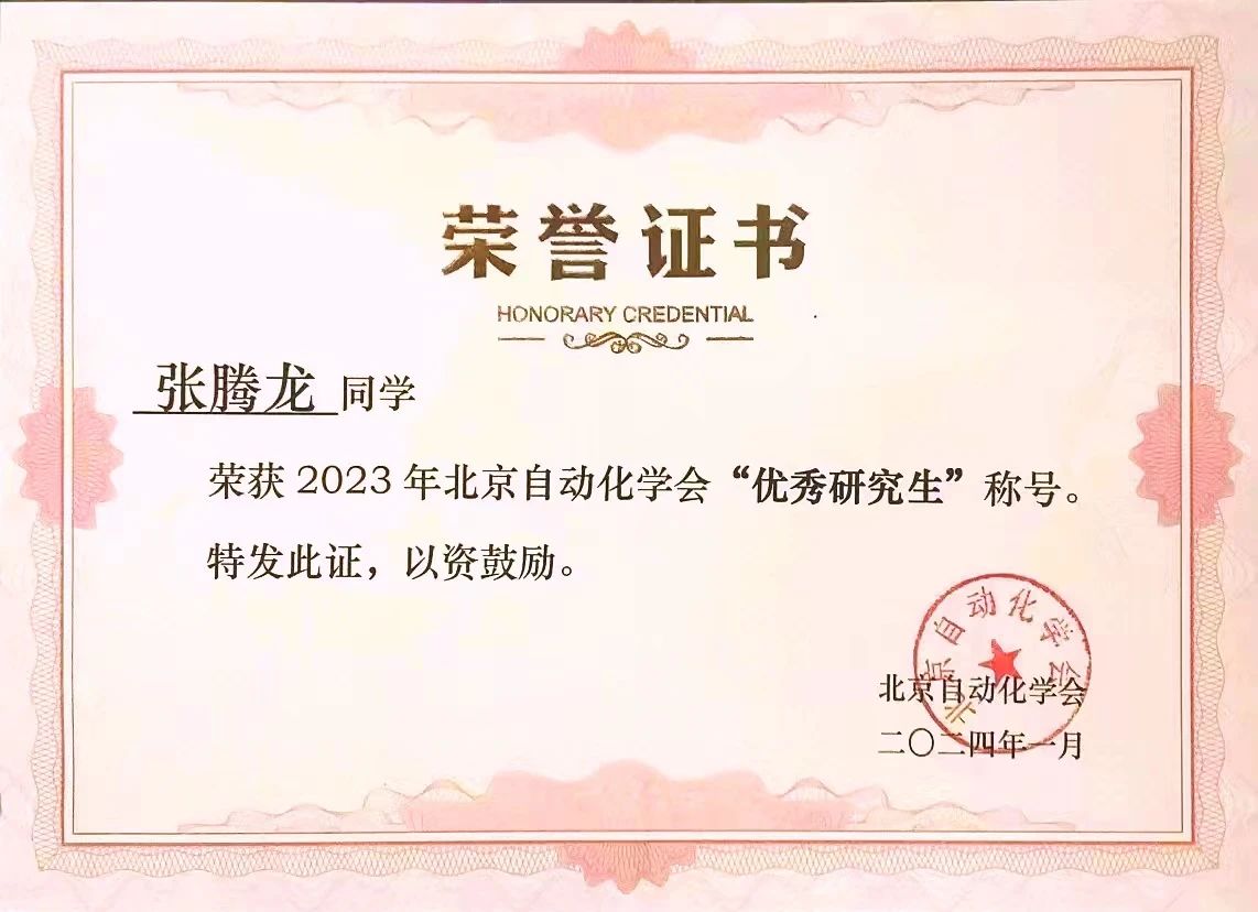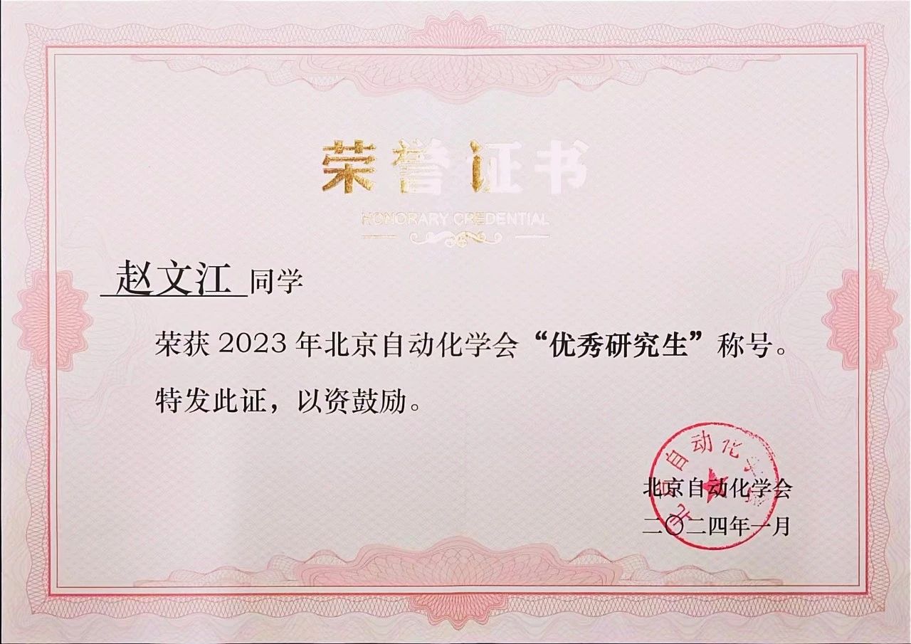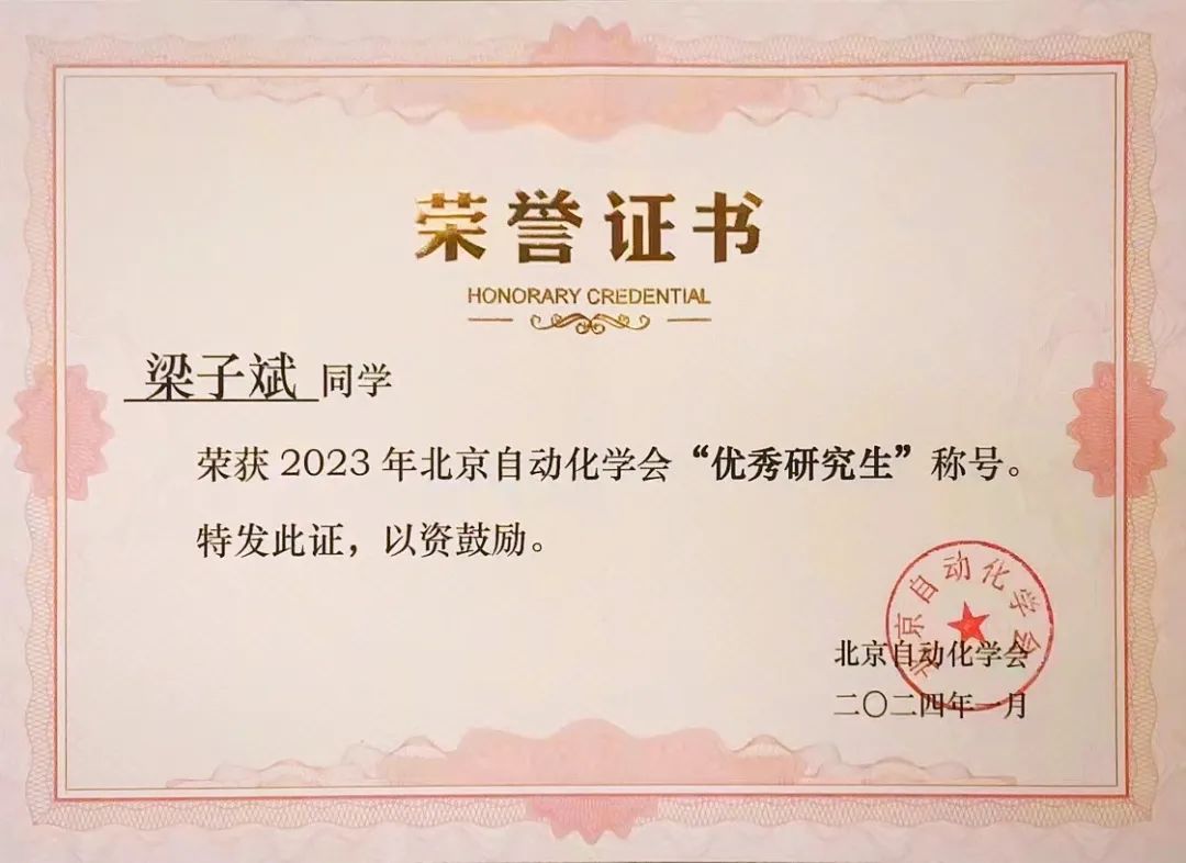 非常荣幸能够获得“北京市自动化学会优秀研究生”这一荣誉。首先,我要感谢我的母校,为我提供了丰富的学习资源和良好的研究环境。在这里,我不仅系统地学习了自动化领域的专业知识,而且还锻炼了我的科研能力和创新思维。导师的悉心指导和同伴的互助协作,使我在学术道路上不断进步。