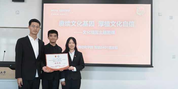 智能2401团支部刘书开、池星豪、朱培昇三名同学以“赓续文化基因 厚植文化自信”为题,通过对中华优秀传统文化、革命文化和社会主义先进文化的梳理和讲述进行文化强国主题团课的答辩,表达青年勇担时代重任,坚定文化自信的决心和勇气。