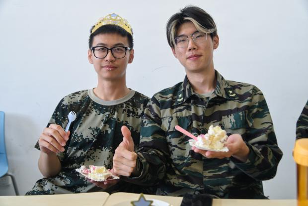 随后,进入“寿星风采”环节。寿星们依次起身自我介绍并畅谈近期军训的感受。大家纷纷表示,军训虽有体力上的辛苦,但与同学们并肩训练、互相鼓励的过程格外有意义,不仅磨砺了意志,还收获了珍贵的友谊;同时,大家也对学院和老师的用心筹备表达感谢,认为这场军训期间的集体生日会,会成为自己大学生涯中一段难忘的回忆。