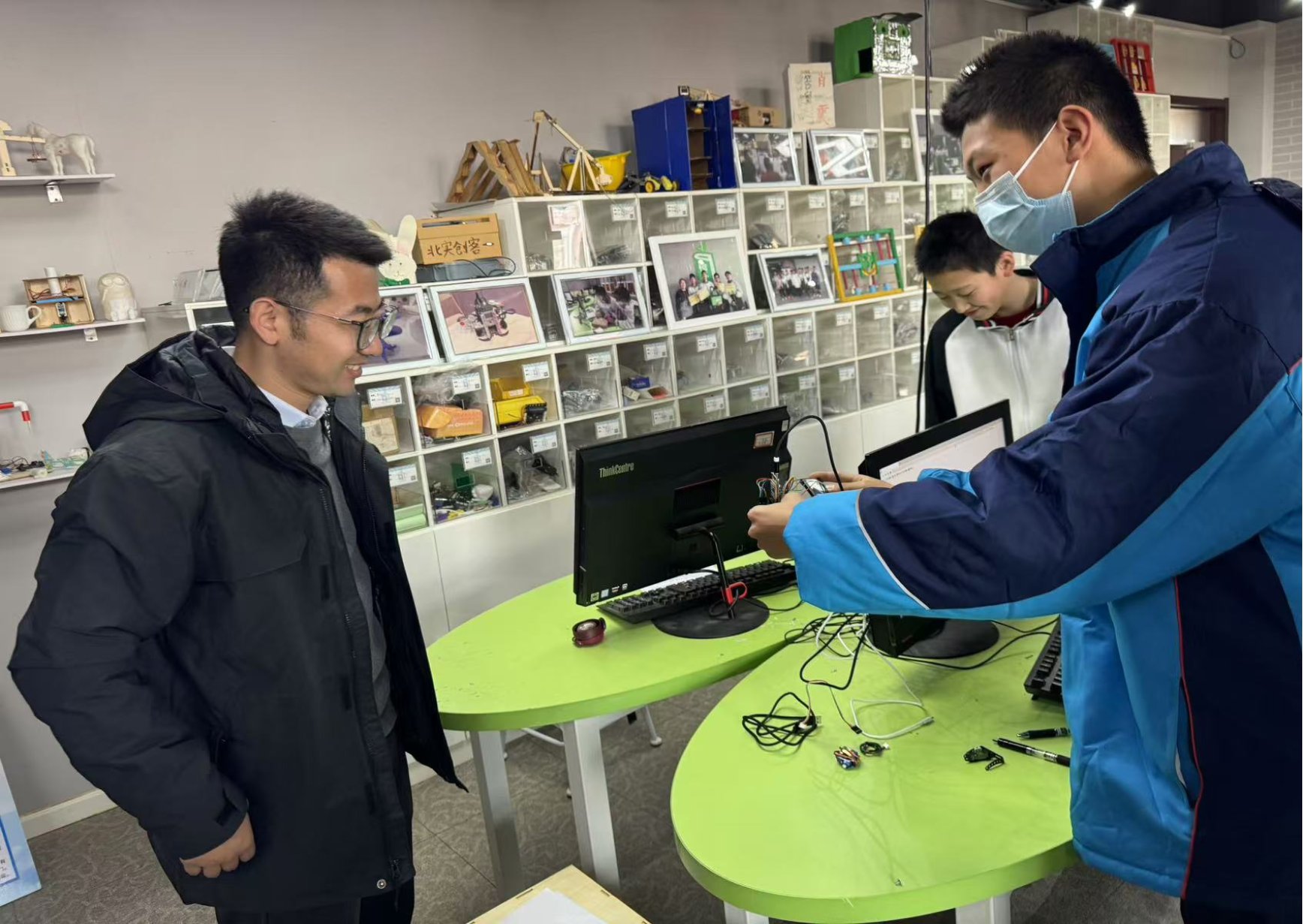 会后,一行共同参观了密云实验中学的创客实验室,学生们热情分享他们的的科技成果,现场展示了“作业采集装置”项目的操作流程。王勇军、李焕、辛棣、郭航等研究生耐心解答了在场高中生的项目技术及学业规划方面的疑惑。