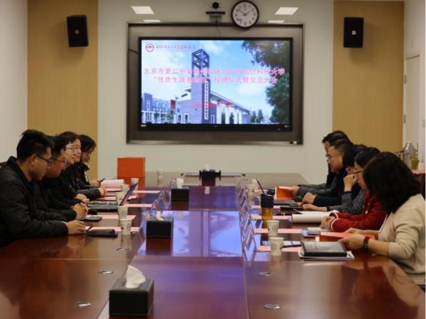双方就招生模式、外培计划、双培计划、就业情况、课程设置、先修课程、研学计划以及冬夏令营等议题进行了深入交流和探讨。此次交流活动不仅让北京市第二中学通州校区进一步了解了我校的招生政策及学科专业特色,也为中学生的学业规划与未来发展提供了清晰指引,促进了中学与高校在人才培养方面的无缝衔接。