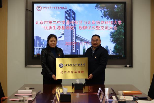 优质生源基地中学的建设是加强高校与中学联系的重要纽带,也是提升人才培养质量的有效途径。我校始终高度重视优质生源基地建设,积极开展“走出去、请进来”的招生宣传系列活动,为优质生源的稳定输送提供了坚实保障。2025年1月7日,我校招生就业工作处处长王蕾、副处长温源、自动化学院党委书记贺芳等相关领导老师前往北京市第二中学通州分校,举行“优质生源基地校”签约授牌仪式。