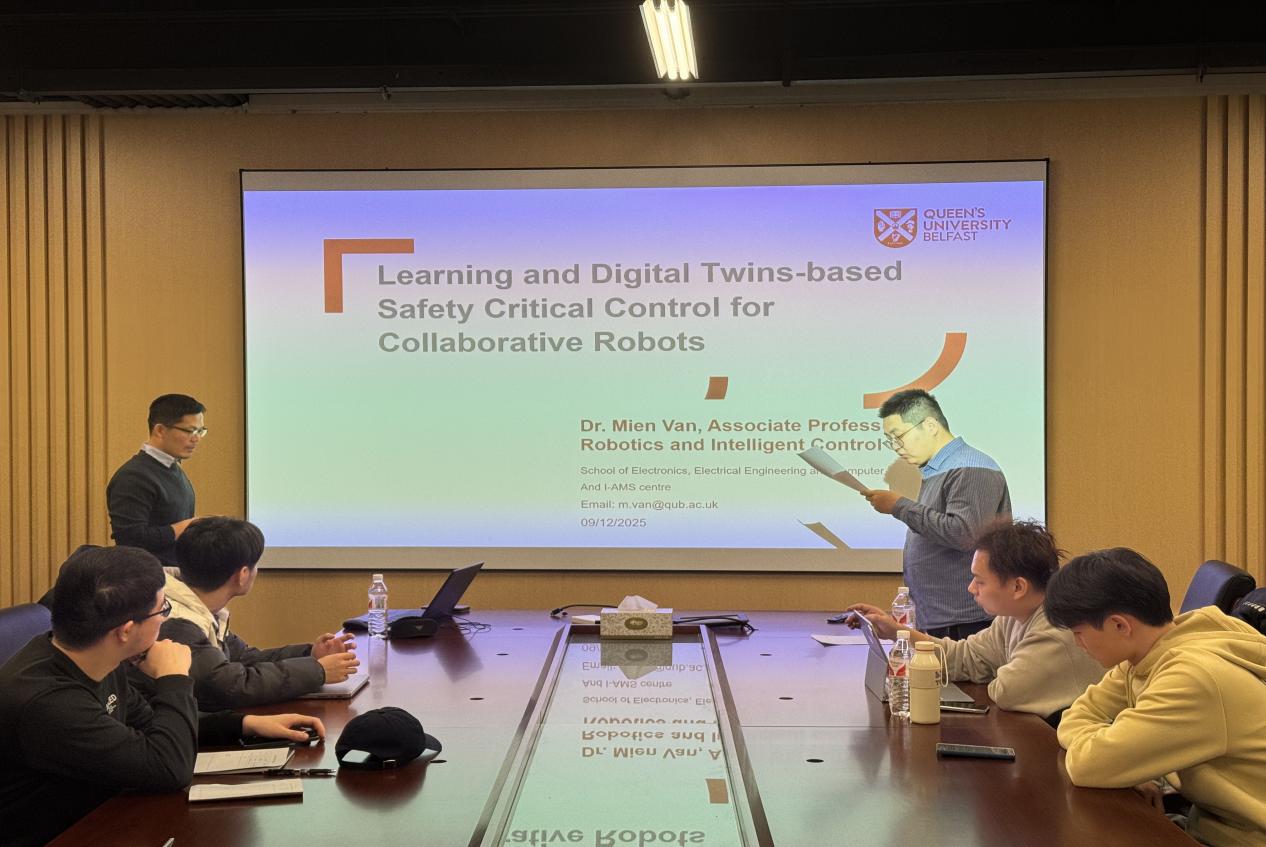 2025年12月9日下午,自动化学院(人工智能学院)邀请国际知名机器人与具身智能领域专家、英国贝尔法斯特女王大学副教授、《IEEE Transactions on Automation Science and Engineering 》《IEEE Transactions on Fuzzy Systems》期刊副主编Mien Van,在沙河校区工学楼C座406开展了题为“Learning and Digital Twins-based Safety Critical Control for Collaborative Robots”的专题学术讲座。