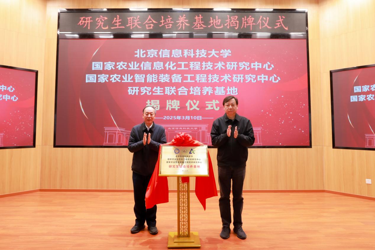 随后,赵春江院士、郭福校长共同为“研究生联合培养基地”揭牌。该基地由北京信息科技大学、国家农业信息化工程技术研究中心、国家农业智能装备工程技术研究中心三方联合成立,旨在进一步提升研究生分类培养质量,探索“人工智能+”教育科技人才协同发展新模式。