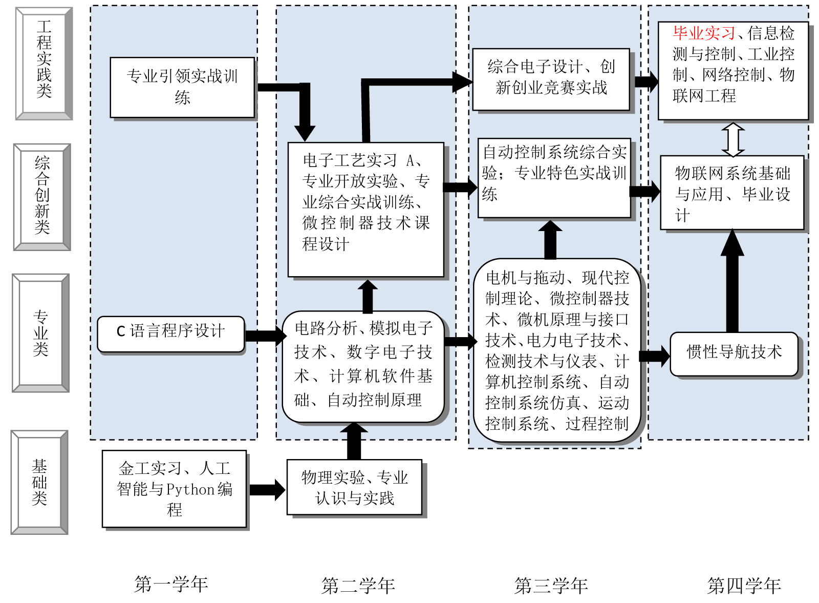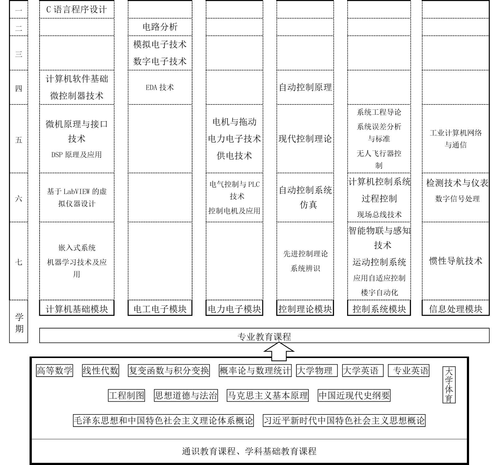 本专业学生除学习公共基础课程外,根据教育部自动化专业规定,参考相关专业认证、专业评估要求,所设置的专业核心课为:自动控制原理、现代控制理论、微控制器技术、电路分析、模拟电子技术、数字电子技术、微机原理与接口技术、计算机控制系统、电力电子技术、检测技术与仪表、电机与拖动、自动控制系统仿真、运动控制系统、过程控制等。